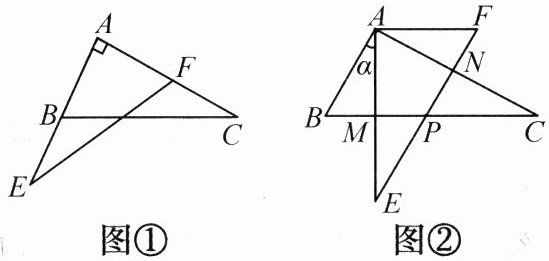 24. (10分)某校九年级数学兴趣小组在学习探究过程中,将两块完全相同的且含$ 60 ^ { \circ } $角的直角三角尺ABC与AFE按如图①所示位置放置. 现将$ \mathrm { Rt } \triangle A E F $绕点A按逆时针方向旋转角$ \alpha $($ 0 ^ { \circ } < \alpha < 90 ^ { \circ } $),如图②,AE与BC相交于点M,AC与EF相交于点N,BC与EF相交于点P.