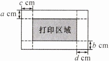 11. 情境题 页边距如图,在打印图片之前,为确定打印区域,需设置纸张大小和页边距(纸张的边线到打印区域的距离),上、下、左、右页边距分别为a cm,b cm,c cm,d cm. 若纸张大小为16cm×10cm,考虑到整体的美观性,要求各页边距相等并使打印区域的面积占纸张的70%,则需如何设置页边距?