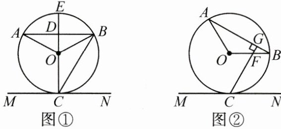 (1)如图①,若$AB// MN$,直径 CE 与 AB 相交于点 D,求$\angle AOB和\angle BCE$的大小;