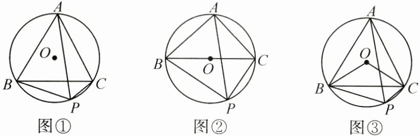 25. (14 分)已知$\odot O$为等腰三角形 ABC 的外接圆,$AB = AC$,P 为$\widehat{BC}$上任一点,连接 PB,PC.