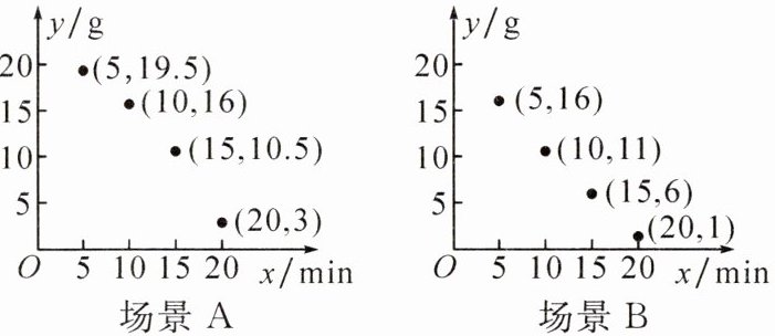 13. 数学思想 建模思想 为研究某种化学试剂的挥发情况,某研究团队在两种不同的场景下做对比实验,收集了该试剂挥发过程中剩余质量$ y ( \mathrm { g } ) $随时间$ x ( \mathrm { min } ) $变化的数据$ ( 0 \leq x \leq 20 ) $,并分别绘制在平面直角坐标系中,如图所示.