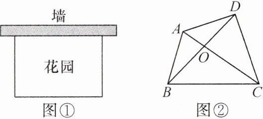 (2)如图①,用篱笆围一个面积为$32m^{2}$的长方形花园,使这个长方形花园的一边靠墙(墙长$20m$),问这个长方形的长、宽各为多少时,所用的篱笆最短,最短的篱笆是多少?
