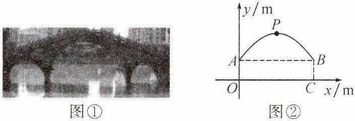 7. (2024·武威凉州区三模)如图①所示是一座古桥,桥拱截面为抛物线,如图②,AO,BC是桥墩,桥的跨径AB为20m,此时水位在OC处,桥拱最高点P离水面6m,在水面以上的桥墩AO,BC都为2m.以OC所在的直线为x轴、AO所在的直线为y轴建立平面直角坐标系,其中x(m)是桥拱截面上一点距桥墩AO的水平距离,y(m)是桥拱截面上一点距水面OC的距离.