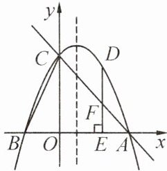 (2)易得$A(2,0)$,$C(0,2)$,则直线$AC$的解析式为$y=-x+2$.$\because$点$D$的横坐标为$m$,$\therefore D(m,-m^{2}+m+2)(0\lt m\lt2)$,$F(m,-m+2)$,$\therefore DF=(-m^{2}+m+2)-(-m+2)=-m^{2}+2m=-(m-1)^{2}+1$.$\because$此抛物线的开口向下,$\therefore$当$m=1$时,线段$DF$的长度最大,此时$-m^{2}+m+2=-1+1+2=2$.$\therefore D(1,2)$.