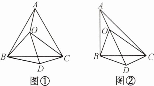 (2)如图②,O是等腰直角三角形ABC($\angle ABC = 90^{\circ}$)内一点,连接OA,OB,OC,将$\triangle BAO$绕点B顺时针旋转后得到$\triangle BCD$,连接OD。当OA,OB,OC满足什么条件时,$\angle ODC = 90^{\circ}$?请给出证明。