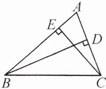 取 $ BC $ 的中点 $ O $,连接 $ OD $,$ OE $。在 $ Rt△BDC $ 和 $ Rt△BEC $ 中,由直角三角形斜边上的中线等于斜边的一半,得 $ OD = \frac{1}{2}BC = OE = OB = OC $,$\therefore$ 点 $ E $,$ B $,$ C $,$ D $ 在同一个圆上。