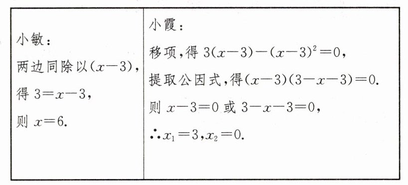 8. 解:小敏× 小霞× 正确的解答:移项,得$3(x - 3) - (x - 3)^2 = 0$.提取公因式,得$(x - 3)(3 - x + 3) = 0$.则$x - 3 = 0$或$3 - x + 3$