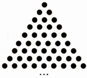 【素材】如图,这是一个三角点阵,从上向下数有无数行,其中第一行有 $ 1 $ 个点,第二行有 $ 2 $ 个点……第 $ n $ 行有 $ n $ 个点. 如果要用试验的方法,由上而下逐行相加其点数,容易发现,前 $ n $ 行的点数和是 $ 1 + 2 + 3 + \cdots + (n - 2) + (n - 1) + n $,可以发现 $ 2[1 + 2 + 3 + \cdots + (n - 2) + (n - 1) + n] = [1 + 2 + 3 + \cdots + (n - 2) + (n - 1) + n] + [n + (n - 1) + (n - 2) + \cdots + 3 + 2 + 1] $,把两个中括号中的第一项相加,第二项相加……第 $ n $ 项相加,整个式子等于 $ n(n + 1) $,于是得到 $ 1 + 2 + 3 + \cdots + (n - 2) + (n - 1) + n = \frac{1}{2}n(n + 1) $. 这就是说,三角点阵中前 $ n $ 行的点数和是 $ \frac{1}{2}n(n + 1) $.