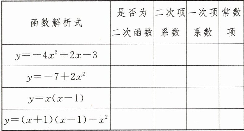 4. 判断下列函数是否为二次函数,若是二次函数,分别写出它们的二次项系数、一次项系数和常数项.