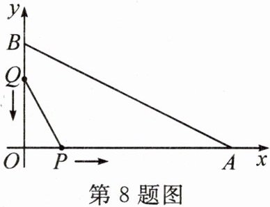8. 如图,在平面直角坐标系中,$OA=12\ cm$,$OB=6\ cm$,点$P$从点$O$开始沿$OA$边向点$A$以$1\ cm/s$的速度移动,点$Q$从点$B$开始沿$BO$边向点$O$以$2\ cm/s$的速度移动,点$P$,$Q$同时出发,当其中一点到达终点时,另一点也随之停止运动.设运动时间为$t\ s$,$\triangle POQ$的面积为$y\ cm^{2}$,当$\triangle POQ$的面积最大时,$t$的值为