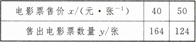 9. (2024·滨州)春节期间,全国各影院上映多部影片,某影院每天运营成本为2000元,该影院每天售出的电影票数量 $ y $(张)与售价 $ x $(元/张)之间满足一次函数关系($ 30 \leq x \leq 80 $,且 $ x $ 是整数),部分数据如下表所示:
