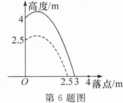 6. (2022·南充) 如图,水池中心点 $ O $ 处竖直安装一根水管,水管喷头喷出抛物线形水柱,喷头上下移动时,抛物线形水柱随之竖直上下平移,水柱落点与点 $ O $ 在同一水平面. 安装师傅调试发现,喷头高 $ 2.5 \, m $ 时,水柱落点距点 $ O2.5 \, m $;喷头高 $ 4 \, m $ 时,水柱落点距点 $ O3 \, m $. 那么当喷头高