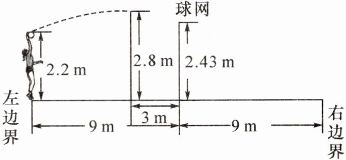 8. 如图,排球运动场的场地长 $ 18 \, m $,球网高 $ 2.43 \, m $,球网在场地中央,距离球场左、右边界均为 $ 9 \, m $. 一名球员在场地左侧边界练习发球,排球的飞行路线可以看作是对称轴垂直于水平面的抛物线的一部分. 某次发球,排球从左边界的正上方发出,击球点的高度为 $ 2.2 \, m $,当排球飞行到距离球网 $ 3 \, m $ 时达到最大高度 $ 2.8 \, m $. 小洛在图中建立了平面直角坐标系,求得该抛物线的解析式为 $ y = -\frac{1}{60}x^2 + 2.8 $. 根据以上信息,解答下列问题:
