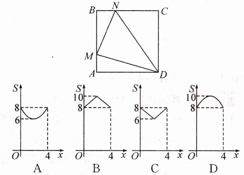 2. (2023·齐齐哈尔)如图,在正方形 $ ABCD $ 中,$ AB = 4 $,动点 $ M $,$ N $ 分别从点 $ A $,$ B $ 同时出发,沿射线 $ AB $、射线 $ BC $ 的方向匀速运动,且速度的大小相等,连接 $ DM $,$ MN $,$ ND $。设点 $ M $ 运动的路程为 $ x ( 0 \leqslant x \leqslant 4 ) $,$ \triangle DMN $ 的面积为 $ S $,下列图象中能反映 $ S $ 与 $ x $ 之间函数关系的是(