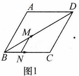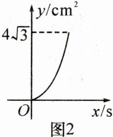 5. (2024·兰州)如图1,在菱形 $ ABCD $ 中,$ \angle ABC = 60^{\circ} $,连接 $ BD $,点 $ M $ 从点 $ B $ 出发沿 $ BD $ 方向以 $ \sqrt{3} cm/s $ 的速度运动至点 $ D $,同时点 $ N $ 从点 $ B $ 出发沿 $ BC $ 方向以 $ 1 cm/s $ 的速度运动至点 $ C $,设运动时间为 $ x ( s ) $,$ \triangle BMN $ 的面积为 $ y ( cm^2 ) $。$ y $ 与 $ x $ 的函数图象如图2所示,则菱形 $ ABCD $ 的边长为(
