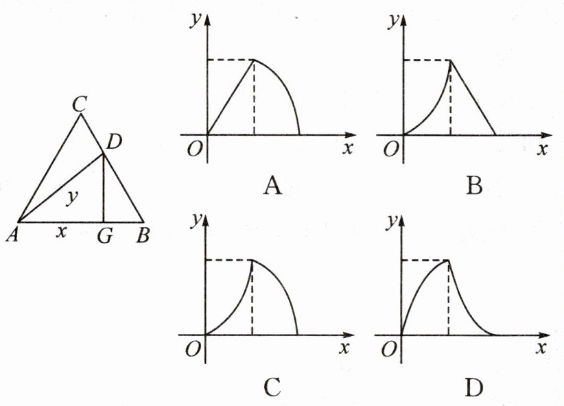 1. 如图,等边三角形 $ ABC $ 的边长为 $ 1 $,点 $ D $ 从点 $ A $ 出发,沿 $ A \to C \to B $ 的路径运动,过点 $ D $ 作边 $ AB $ 的垂线,交 $ AB $ 于点 $ G $,设线段 $ AG $ 的长为 $ x $,$ Rt \triangle AGD $ 的面积为 $ y $,则 $ y $ 与 $ x $ 的函数图象正确的是(