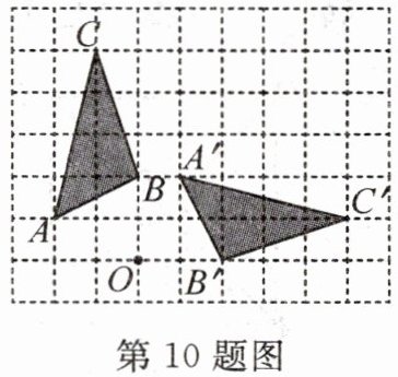 10. 在如图所示的方格纸中,△ABC的顶点都在格点上,将△ABC绕点O按顺时针方向旋转得到△A'B'C',使各顶点仍在格点上,则其旋转角的度数是