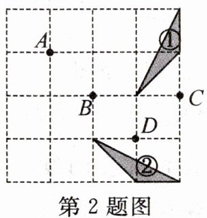 2. 如图,在 $ 4 × 4 $ 的正方形网格中,其中一个三角形①绕某点旋转一定的角度,得到三角形②,则其旋转中心是点