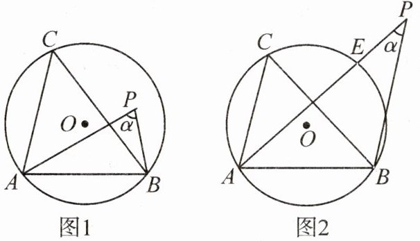 (2)当船与两个灯塔的夹角$\alpha$小于“危险角”时,船位于$\odot O$外.理由如下:连接$BE.\because\angle AEB = \angle C$,$\angle AEB > \angle P$,$\therefore\angle C > \angle P$,即$\alpha < \angle C.\therefore$当船与两个灯塔的夹角$\alpha$小于“危险角”时,船位于$\odot O$外.