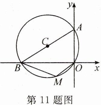 11. 如图,$\odot C$ 过原点 $O$,且与 $y$ 轴、$x$ 轴分别交于点 $A$,$B$,点 $A$ 的坐标为 $(0, 3)$,$M$ 是第三象限内 $\widehat{OB}$ 上一点,$\angle BMO = 120^{\circ}$,则点 $B$ 的坐标为