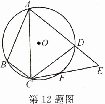 12. 如图,四边形 $ABCD$ 内接于 $\odot O$,$F$ 是 $\widehat{CD}$ 上一点,且 $\widehat{DF} = \widehat{BC}$,连接 $CF$ 并延长交 $AD$ 的延长线于点 $E$,连接 $AC$. 若 $\angle ABC = 105^{\circ}$,$\angle BAC = 30^{\circ}$,则 $\angle E$ 的度数为