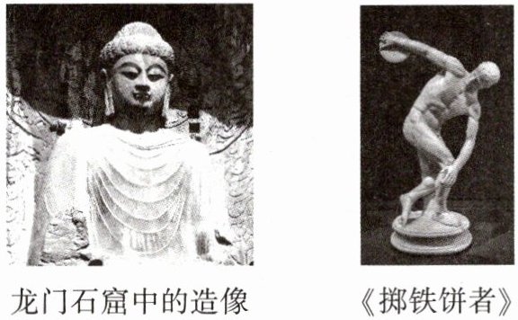 龙门石窟造像继承了秦汉以来我国雕塑艺术的优良传统,也吸收了外来佛教造型艺术的特点,堪称宏伟精巧的雕刻艺术品;《掷铁饼者》是古希腊雕塑艺术中的杰作之一,成为后世艺术创作的典范,也是研究古希腊雕刻的重要资料。