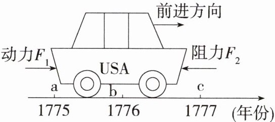 6. [2024广东东莞期末]美国历史的发展经历了种种坎坷。下图所示是美国某一阶段的发展示意图,$F_{1}$是动力,$F_{2}$是阻力。下列关于美国这一阶段历史的说法正确的是(
