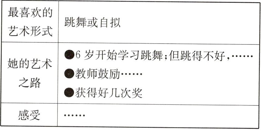 The art form Alice likes best is dancing. She started learning to dance at the age of 6. At first, she didn't dance well. But her teacher encouraged her. Then Alice practiced dancing hard. After that, she won several prizes. Alice thinks dancing is wonderful. It makes her happy and confident. She will keep on dancing.