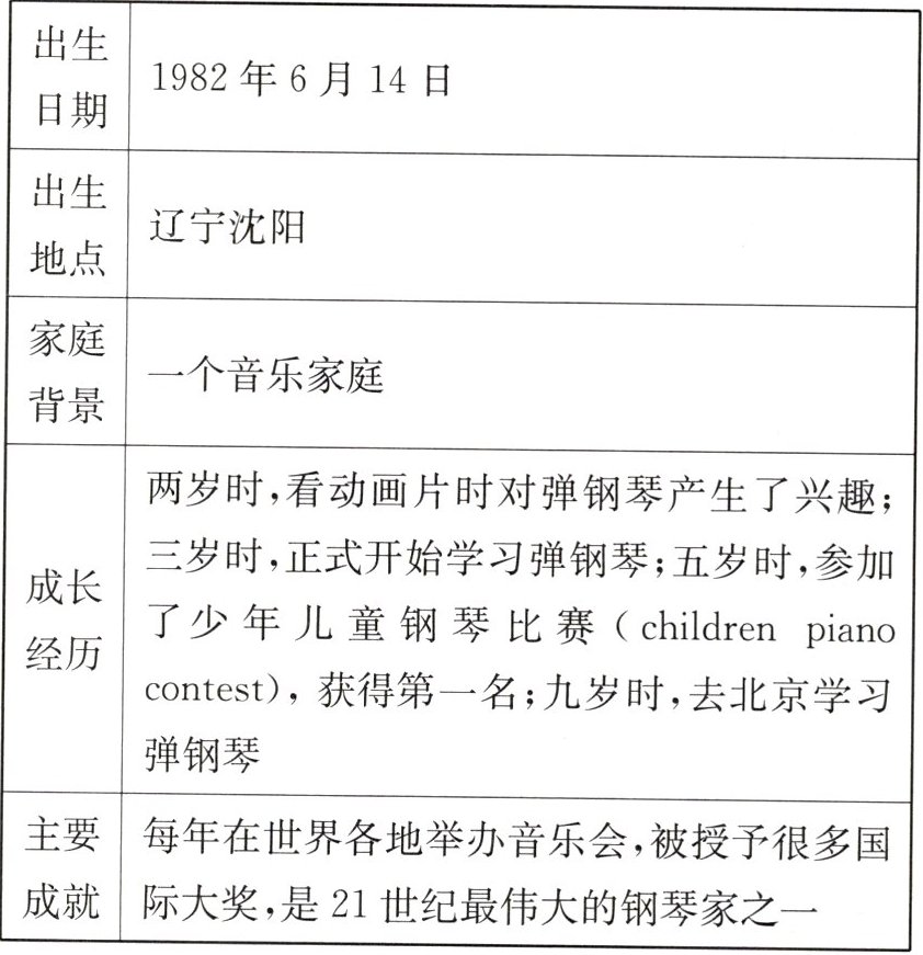 请你根据下表给出的信息,写一篇介绍著名钢琴家郎朗的英语短文。
