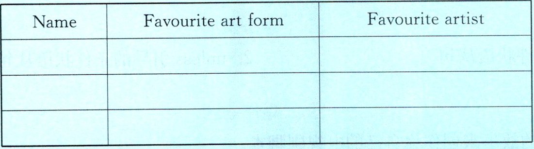 开展采访:根据情境1—3及其情境任务,请你对你的同桌做一个小采访,了解他/她最喜欢的艺术形式和最喜欢的艺术家,将采访内容填写在下面的表格中。