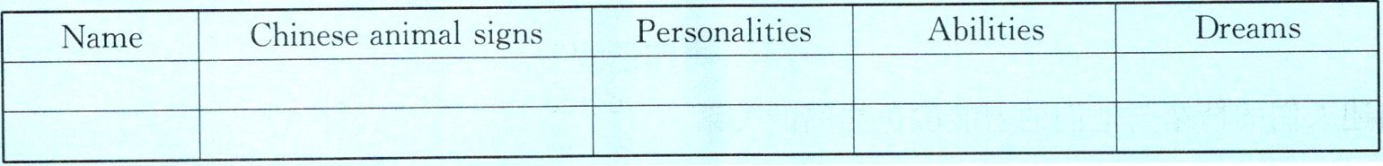 实验班原创 开展采访:根据情境1—3及其情境任务,请你对你的同桌做一个小采访,了解他/她的属相、性格特征、能力、梦想,将采访内容填写在下面的表格中。