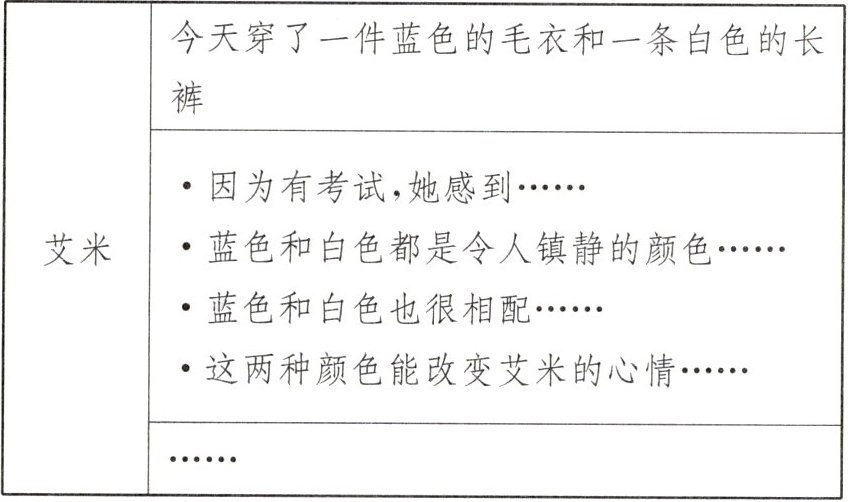 Amy wears a blue sweater and a white pair of trousers today. Because there is an exam, she feels a little nervous. Blue and white are both calm colors. They match each other very well. These two colors can change Amy's mood. She becomes more relaxed. She believes she can do well in the exam.