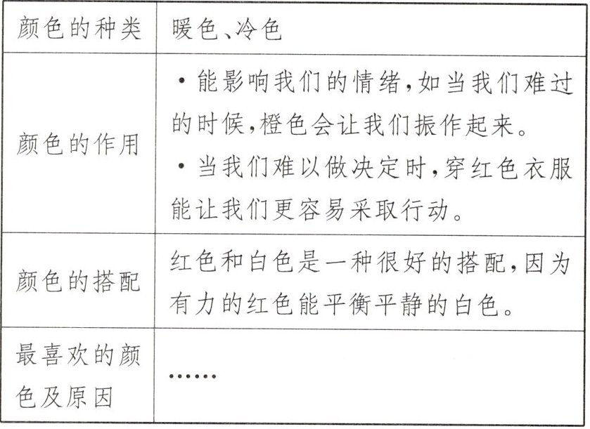 实验班原创 假如海伦所在的学校准备在教师节前举办一场以颜色为主题的英文演讲比赛,她想参加此次比赛,请你根据下面表格中的提示内容,帮助海伦完成她的演讲稿。