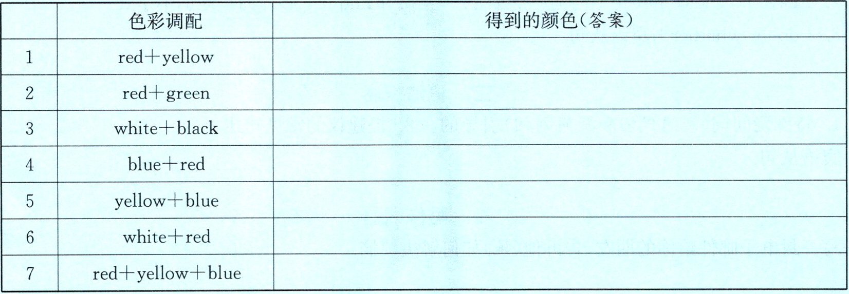| | 色彩调配 | 得到的颜色(答案) |