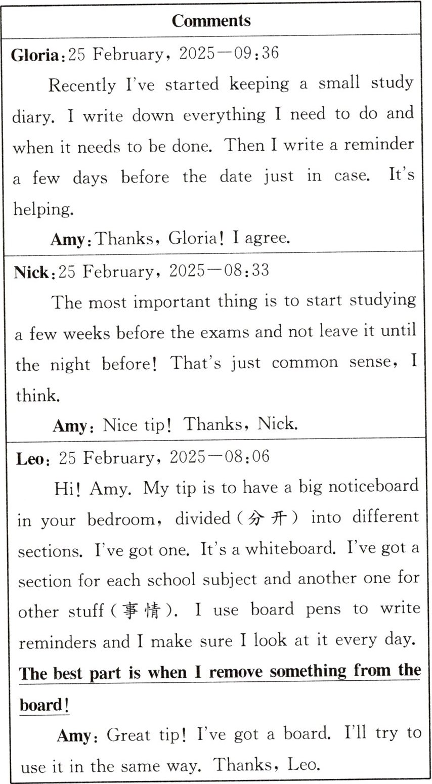 Hi! Amy. My tip is to have a big noticeboard in your bedroom, divided (分开) into different sections. I've got one. It's a whiteboard. I've got a section for each school subject and another one for other stuff (事情). I use board pens to write reminders and I make sure I look at it every day. The best part is when I remove something from the board!