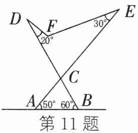 11. 如图是可调躺椅示意图(数据如图),$AE与BD的交点为C$,且$\angle A$、$\angle B$、$\angle E$保持不变。为了舒适,需调整$\angle D$的大小,使$\angle EFD = 110^{\circ}$,则图中$\angle D$应减少