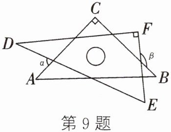 9. 小明把一副含$45^{\circ}$角、$30^{\circ}$角的三角尺如图摆放,其中$\angle C = \angle F = 90^{\circ}$,$\angle A = 45^{\circ}$,$\angle D = 30^{\circ}$,则$\alpha + \beta$等于(