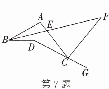 7. 如图,点 D、C、G 在同一直线上,BE 平分$∠ABD$交 AC 于点 E,CF 平分$∠ACG$,BE 的延长线与 CF 相交于点 F.若$∠BDC= 160^{\circ },∠A= 100^{\circ }$,则$∠F= $