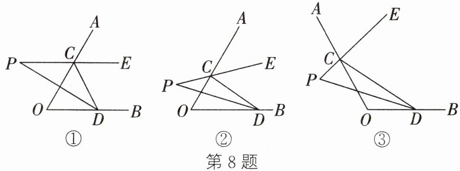 8. (2024 秋·平顶山期末)如图,点 C、D 分别在射线 OA、OB 上,CE 是$∠ACD$的平分线,CE的反向延长线与$∠ODC$的平分线交于点 P.