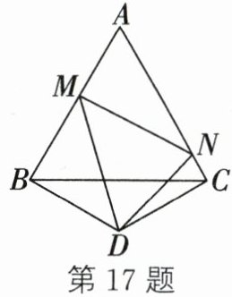 17. 如图,△ABC 是边长为 3 的等边三角形,△BDC 是等腰三角形,且∠BDC = 120°,以 D 为顶点作一个 60°角,使其两边分别交 AB、AC 于点 M、N,连接 MN,则△AMN 的周长为______.