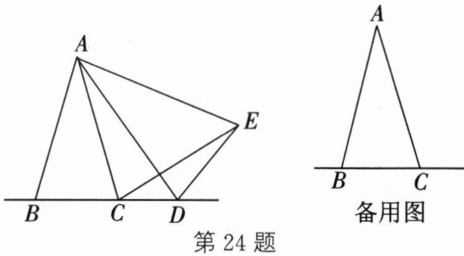 24. (12 分)在△ABC 中,AB = AC,D 是直线 BC 上一点,以 AD 为一条边在 AD 的右侧作△ADE,使 AE = AD,∠DAE = ∠BAC,连接 CE.