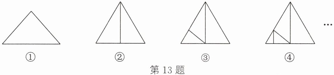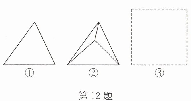 12. (2024秋·苏州姑苏区校级期中)如图,图①中有$1$个三角形,在图①中的三角形内部(不含边界)取一点,连接该点与三角形的$3$个顶点得到图②,图②中共有$4$个三角形.若在图②中的一个小三角形内部(不含边界)取一点,连接该点与该小三角形的$3$个顶点得到图③.在虚线框中画出图③,图③中共有______