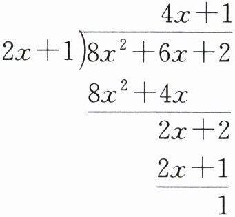 例如:计算$(8x^{2}+6x + 2)÷(2x + 1)$,可用如图的竖式进行计算.因此商式是$4x + 1$,余式是1.