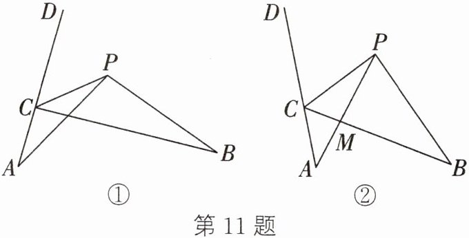 11. 已知$C为射线AD$上一点,$∠DAP = ∠PBC$,$PA = PB$。