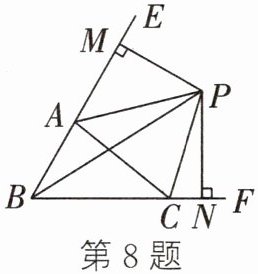 8. 如图,已知$∠ABC$、$∠EAC的角平分线BP$、$AP相交于点P$,$PM⊥BE$,$PN⊥BF$,垂足分别为$M$、$N$。现有四个结论:①$CP平分∠ACF$;②$∠BPC= \frac{1}{2}∠BAC$;③$∠APC = 90^{\circ}-\frac{1}{2}∠ABC$;④$S_{△APM} + S_{△CPN} > S_{△APC}$。其中正确的结论是(