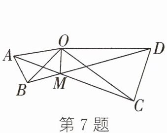 7. 如图,在$△AOB和△COD$中,$OA = OB$,$OC = OD$,$OA < OC$,$∠AOB = ∠COD = 36^{\circ}$。连接$AC$,$BD交于点M$,连接$OM$。有下列结论:①$∠AMB = 36^{\circ}$;②$AC = BD$;③$OM平分∠AOD$;④$MO平分∠AMD$。其中正确的结论有(