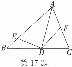 17. 如图,△ABC中,AD是∠BAC的平分线,E、F分别为AB、AC上的点,连接DE、DF,∠EDF+∠BAC= 180°.求证:DE= DF.