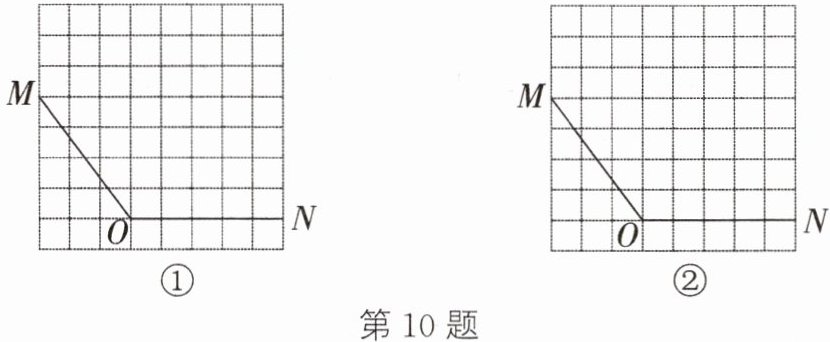 10. 图①、图②均是$8×8$的正方形网格,每个小正方形的顶点称为格点,线段OM、ON的端点均在格点上.在图①、图②给定的网格中以OM、ON为邻边各画一个四边形,使第四个顶点在格点上.要求:① 所画的两个四边形均是轴对称图形;② 所画的两个四边形不全等.