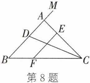 8. 如图,在$\triangle ABC$中,$E$、$F分别是AC$、$BC$上的点,$EF // AB$,$\angle BCA的平分线交AB于点D$,$\angle MAC是\triangle ABC$的外角,若$\angle MAC = \alpha$,$\angle EFC = \beta$,$\angle ADC = \gamma$,则$\alpha$、$\beta$、$\gamma$三者间的数量关系式是(