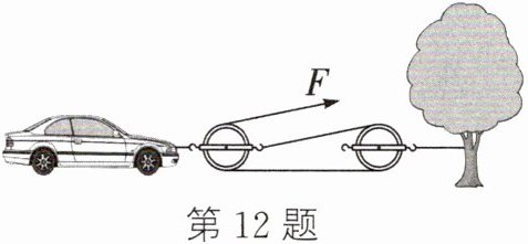 12. 一辆质量为$2×10^3kg$的汽车陷入泥潭中,救援队现用如图所示装置匀速拉动汽车移动2m,汽车移动过程中受到地面的摩擦力是车重的0.12倍(g取10N/kg)。求: